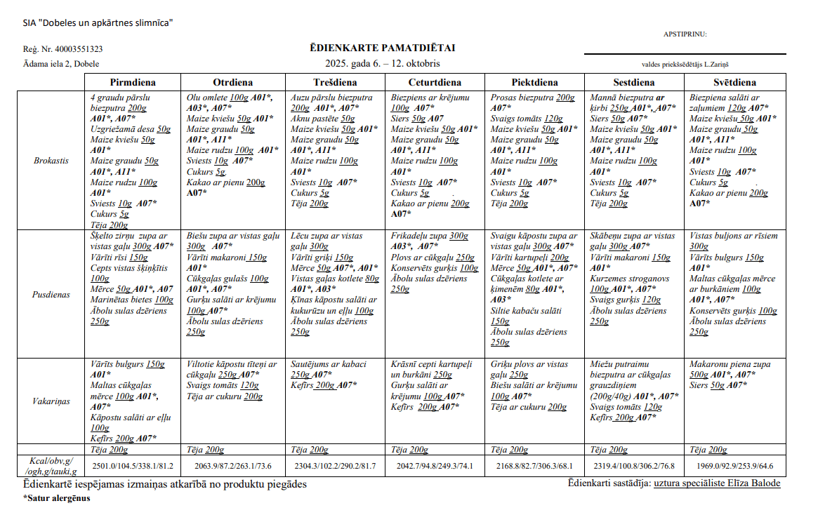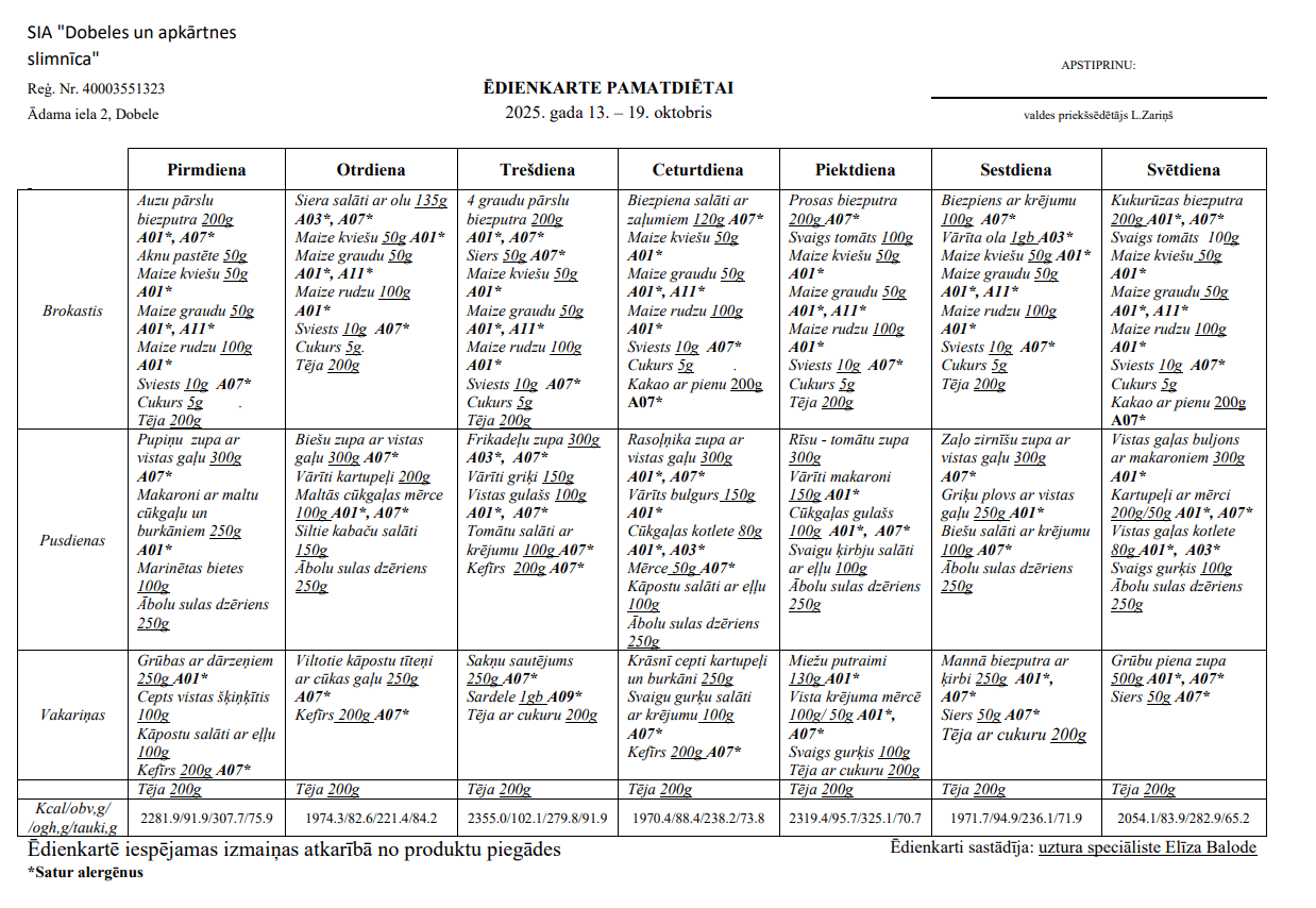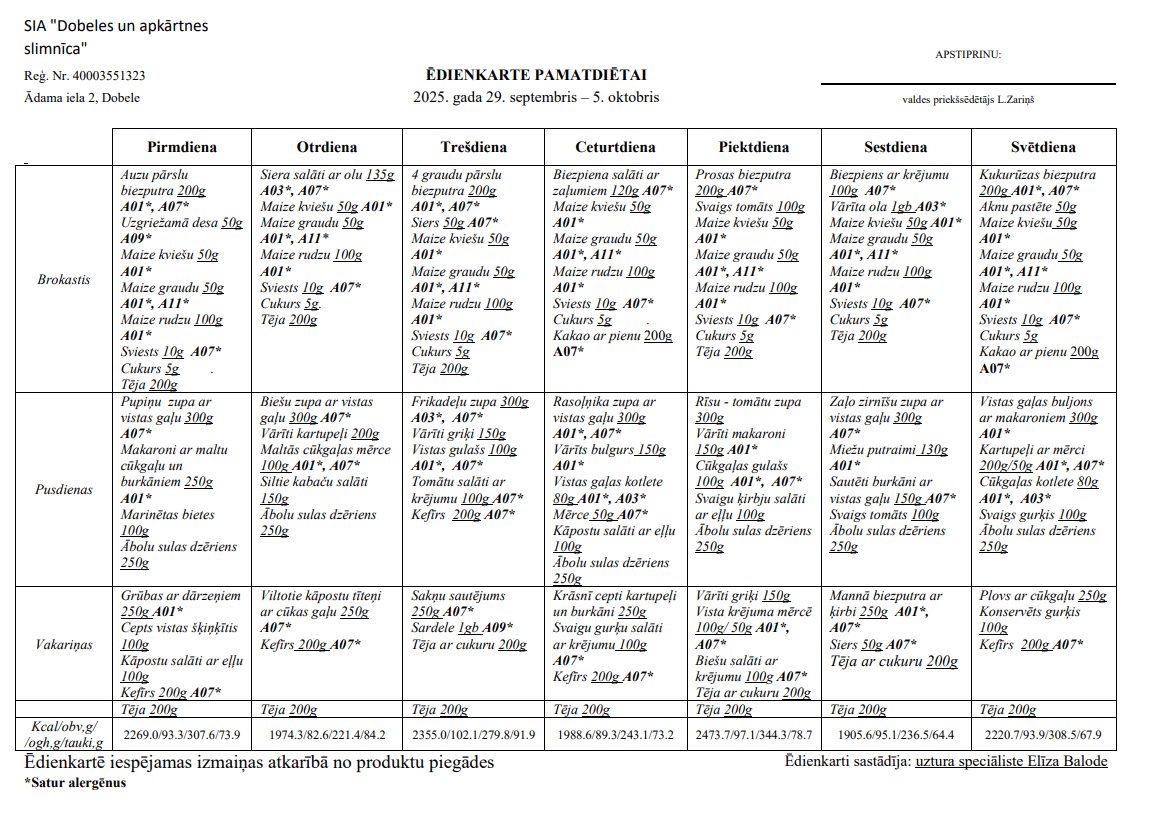 *Gadījumā, ja pacientam nepieciešams piemērot citu ārstnieciskās diētas formu, saņemtais uzturs var atšķirties no ēdienkartē minētā.